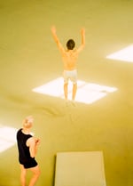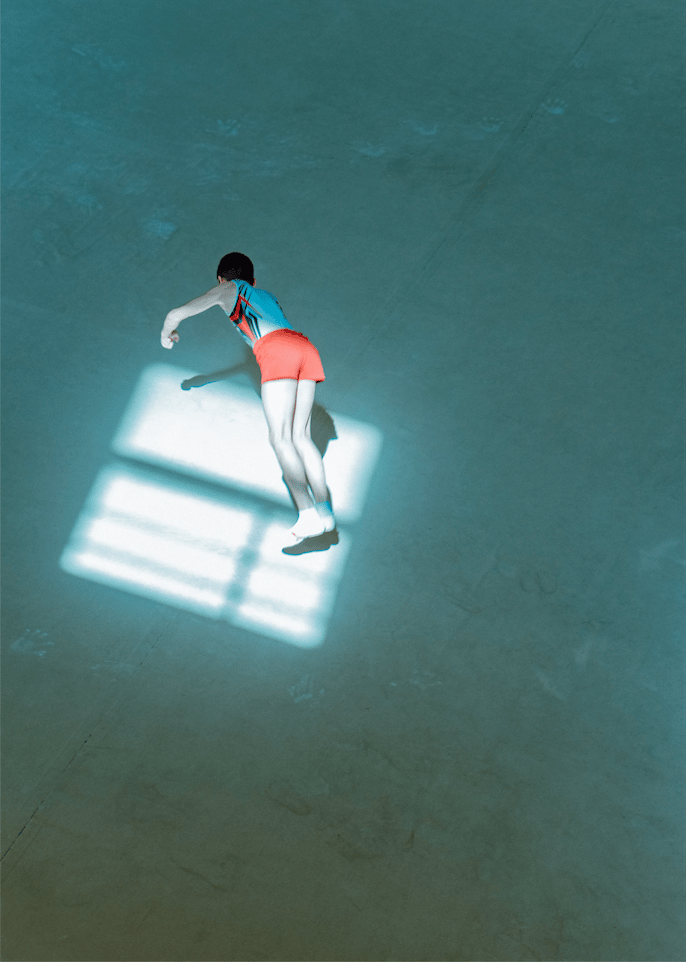 Mouvement. Couleurs. Figures. Les images de David Meskhi se succèdent comme autant de fragments extraits d’un bond, d’un effort, d’une impulsion. À vitesse très rapide, entre hasard et intuition, le photographe saisit une extraordinaire variation de corps sculptés par la lumière et l’apesanteur. Les athlètes, immobilisés dans leurs envolées, sont capturés dans un temps d’arrêt infini. Les bonds deviennent des pauses d’astronautes, les ascensions des plongées défiant la gravité. Parfois, une valse de chevelure, une triangulaire de main et de pied qui chutent dans l’eau bleue, une paire de jambes tendues ; tous semblent faire partie d’un même cosmos. Celui qui se reflète dans les astres dispersés sur quelques pages, la silhouette de la lune en chorégraphe absolue effilant les rythmiques.
